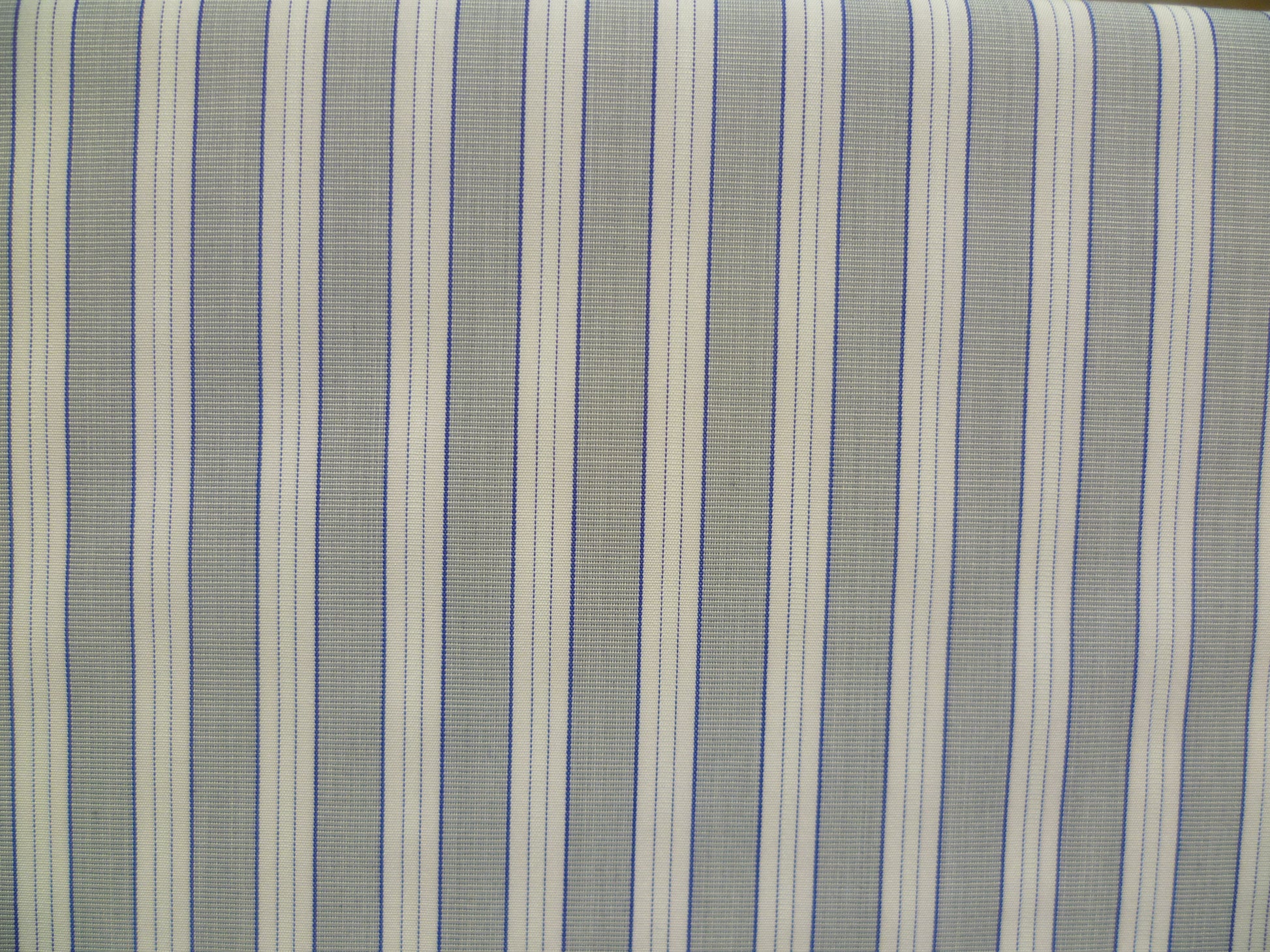 100% Egyptian cotton. 2 ply, super 120. For that fine shirt. From a renowned Italian mill. Gray background with a white and navy stripes.