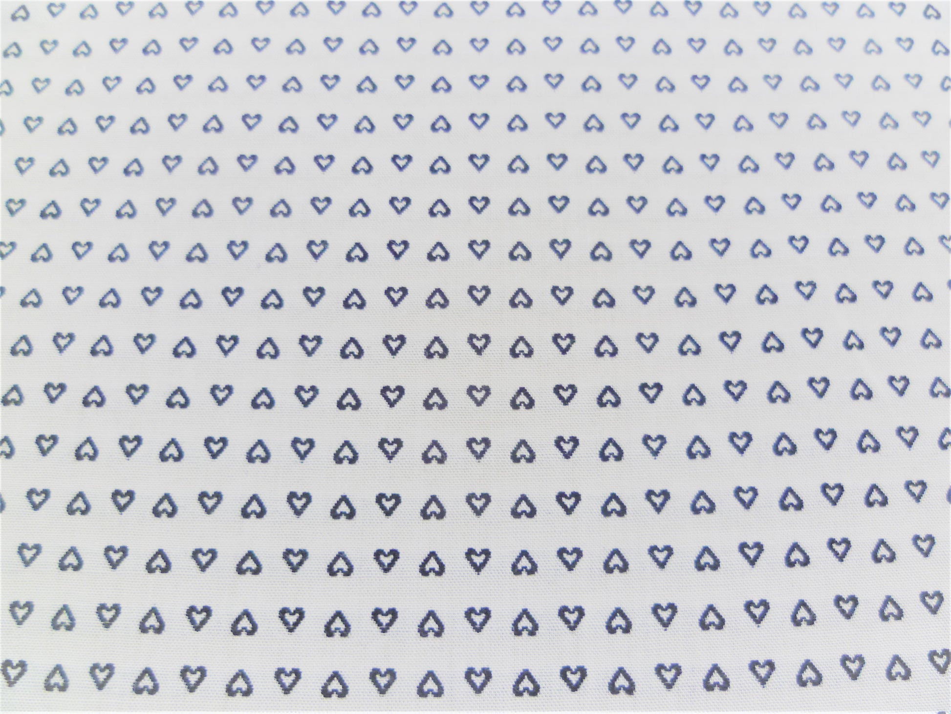 100 % Egyptian cotton from Italy. For that exquisite fun shirt. Dark indigo miniature heart shapes on a white background.