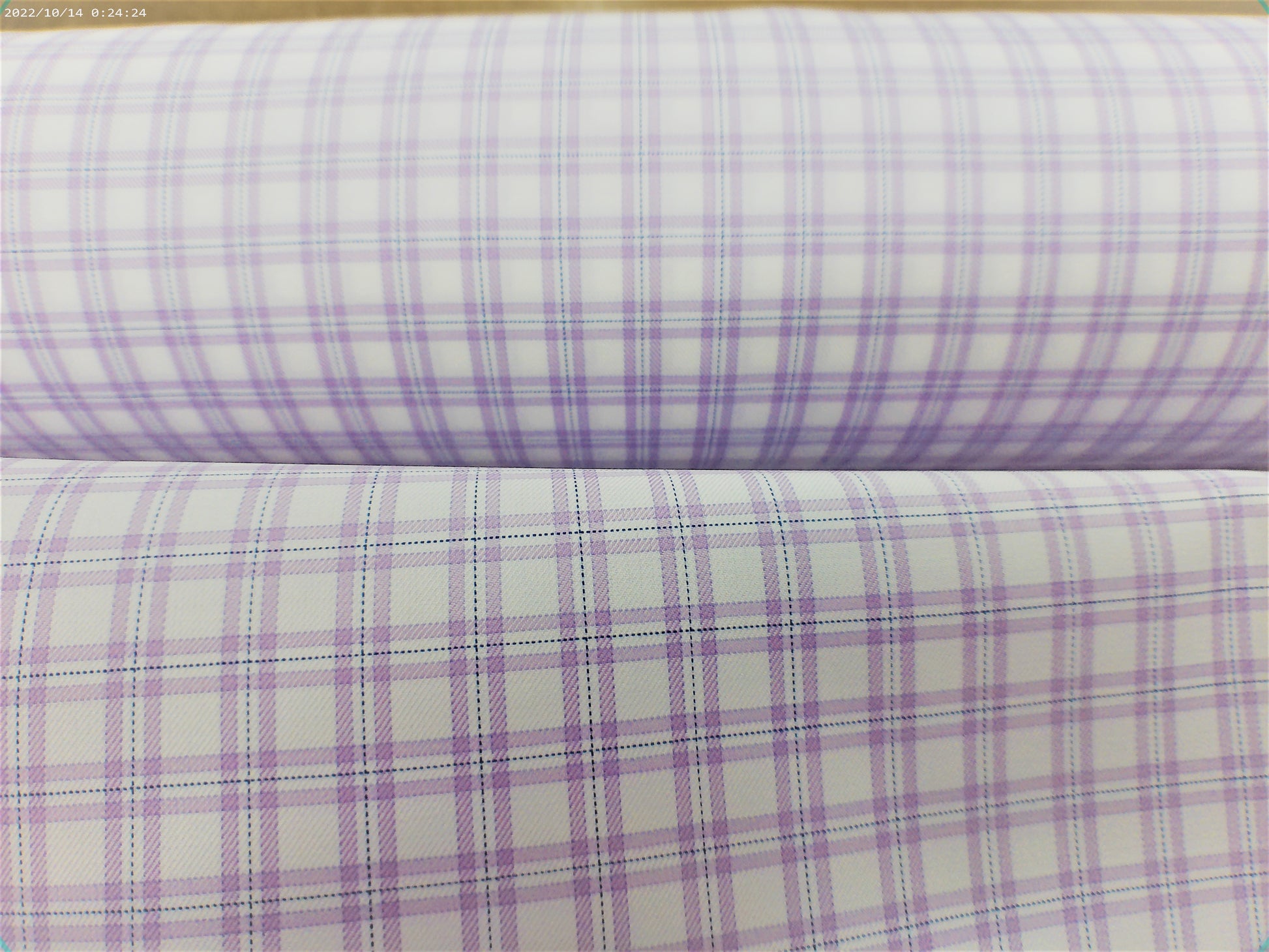 100 % Egyptian cotton, from Italy. For that dress shirt. 2 ply, super 140, mauve and lavender plaid on a white miniature twilled back ground.