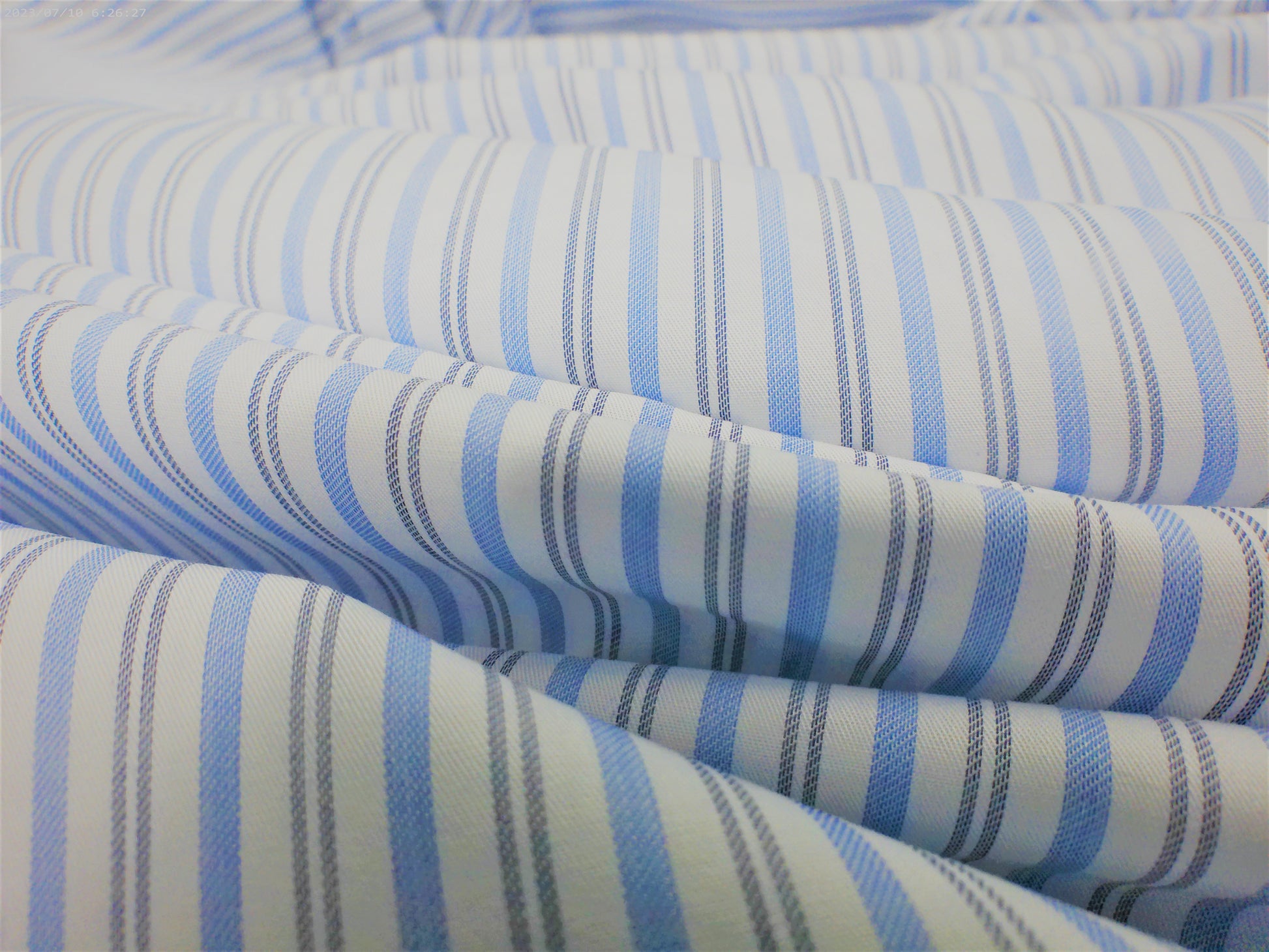 100 % Egyptian cotton, from Italy. Super 120, 2ply. For that fine dress shirt. French blue solid stripe and navy blue double pen stripe on a white back ground.