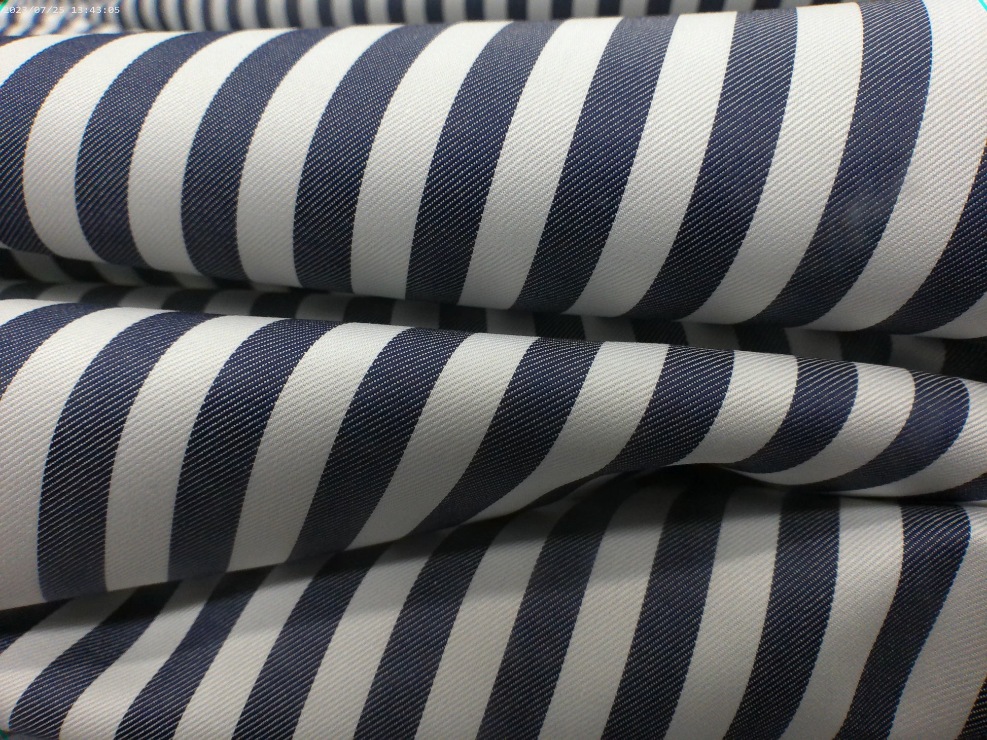 100 % Egyptian cotton from Italy. for that fine dress shirt. 2 ply, super 120. Navy and white 1/4 inch stripe on a fine twilled background.