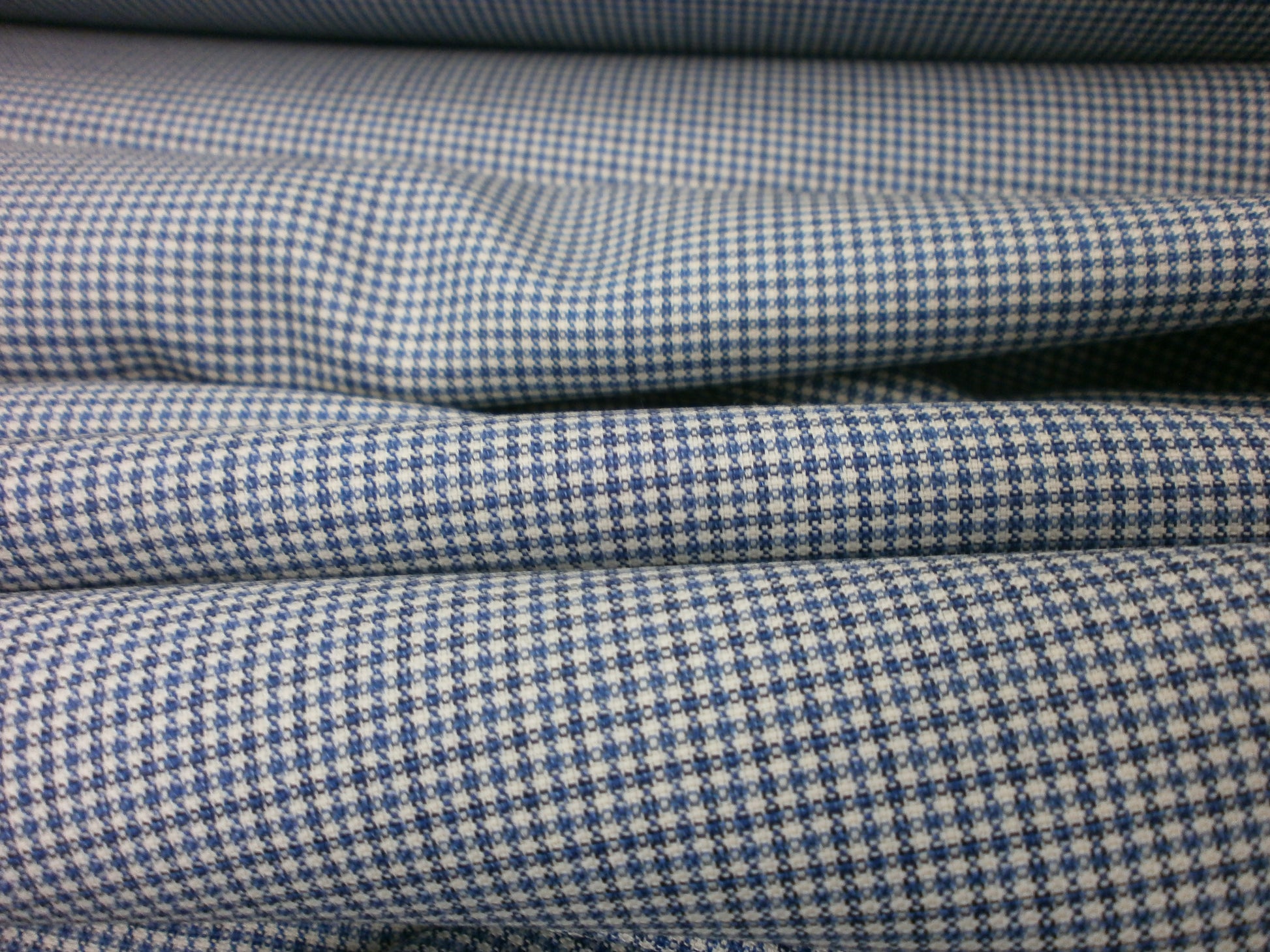 100 % Wool Worsted. For that four season suit , jacket or blazer. From Italy. French blue, sky blue and lapis blue gun club check.