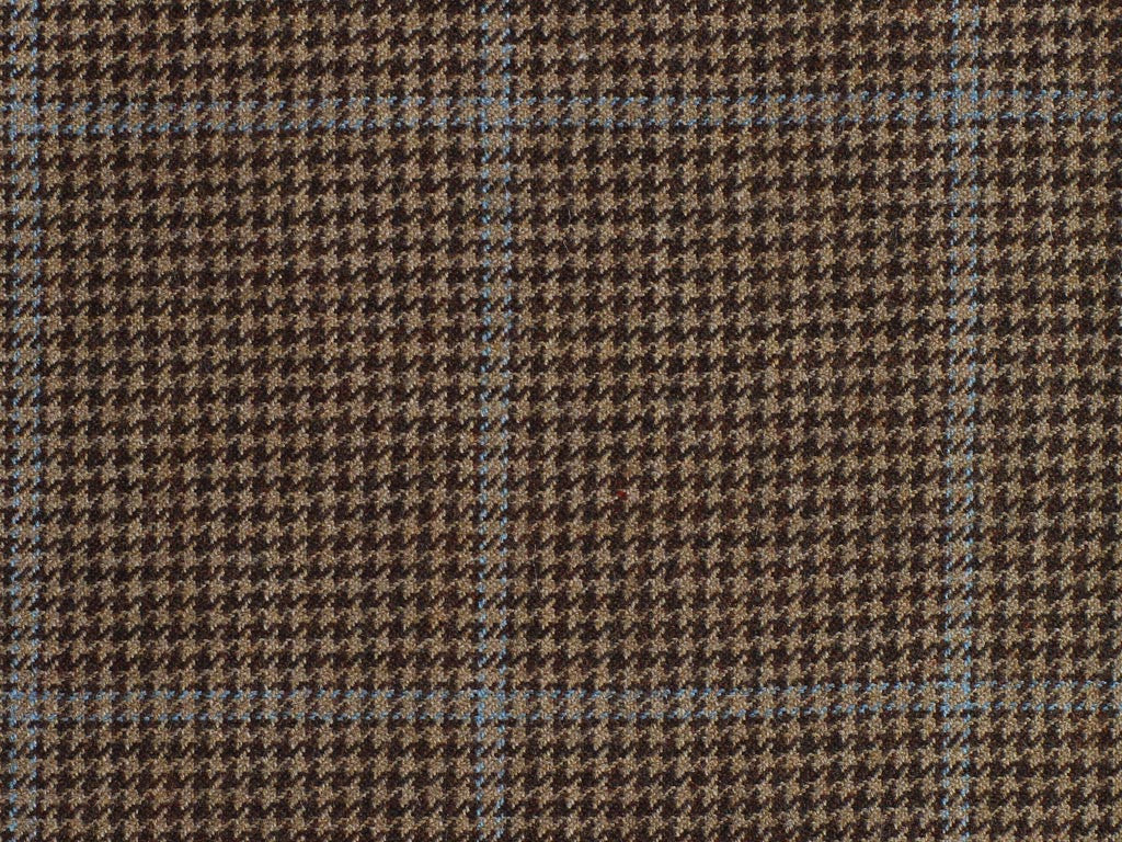 100% wool, perfect for jackets and suits. In a beige and terra cotta houndstooth check with a blue overcheck.