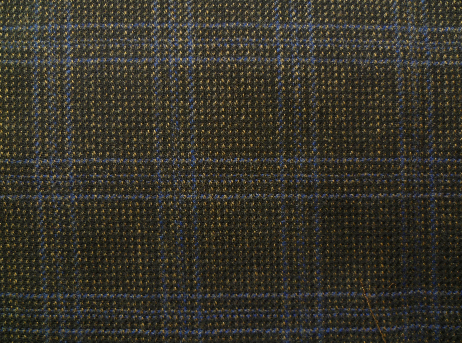 100% wool in a black, bronze, grey background with a royal blue over check from a prominent Italian mill. Excellent for jackets.