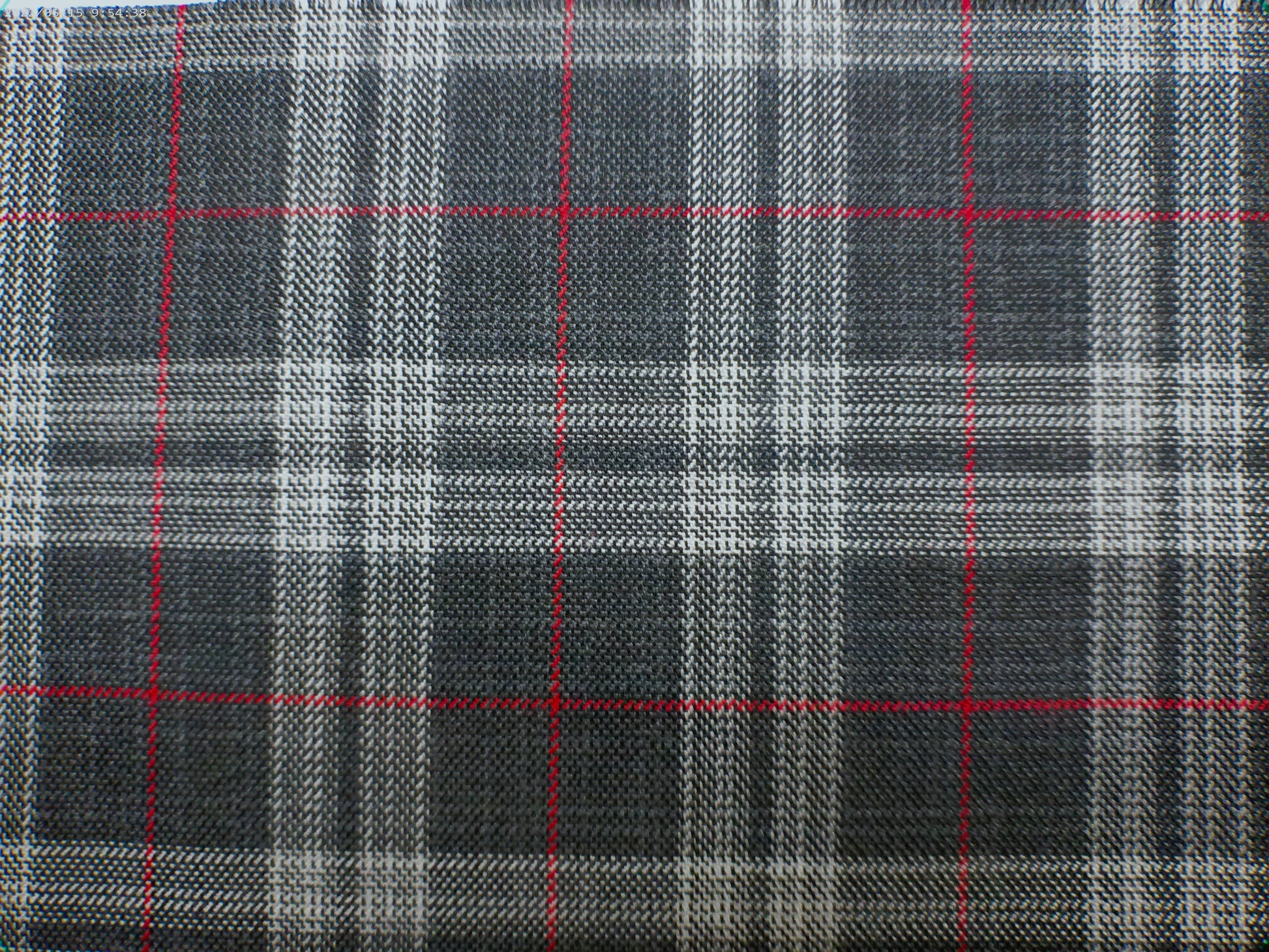 Silk-Linen-Wool from Italy for that fine suit for men and women. Black, silver grey and charcoal grey plaid with a red over checked windowpane.
