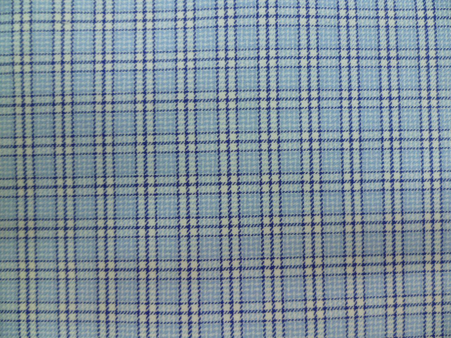 95 % Cotton 5% Cashmere. Super 120 thread count 2ply. From a renowned Italian mill. Sky blue and purple glen check on a blue background. For that perfect dress shirt.